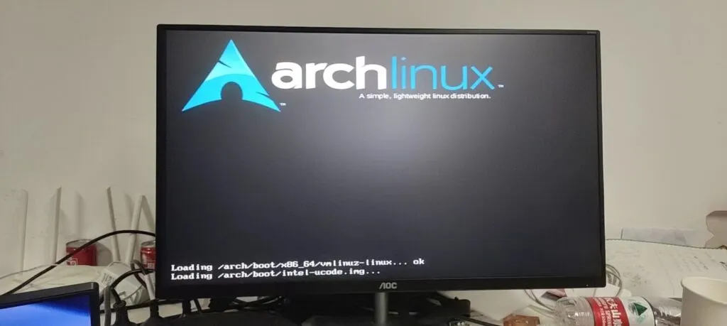 插上启动盘,设置好 U 盘启动,选择 Arch 的镜像,启动。过了好一会,屏幕有了反应!果然,linux 也可以启动,只是太慢了而已,给我系统卡死的错觉。