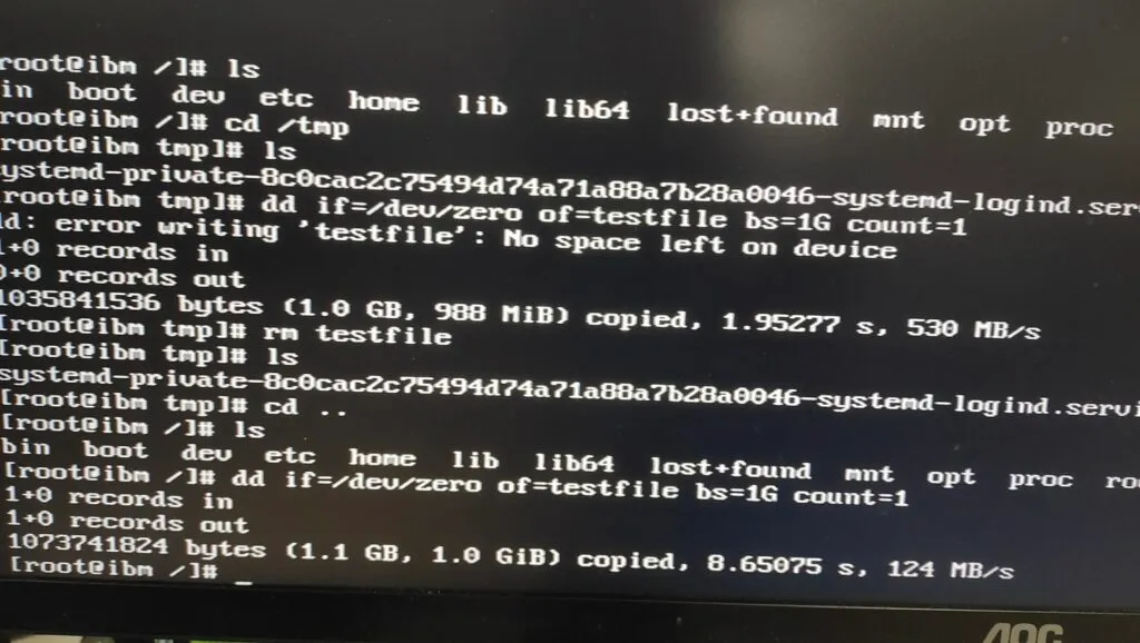 使用 dd 命令写入 1GB 的文件,在 tmpfs 中速度 530MB/s,而在万转机械盘上的根分区下是 124MB/s。虽然已经过去了快 20 年,当年的服务器万转机械盘的连续读写表现与现在家用机械硬盘来比较,速度也是不慢的。而这 DDR2 的内存速度可就不太行了,也就堪堪达到 SATA SSD 的速度。
